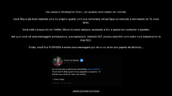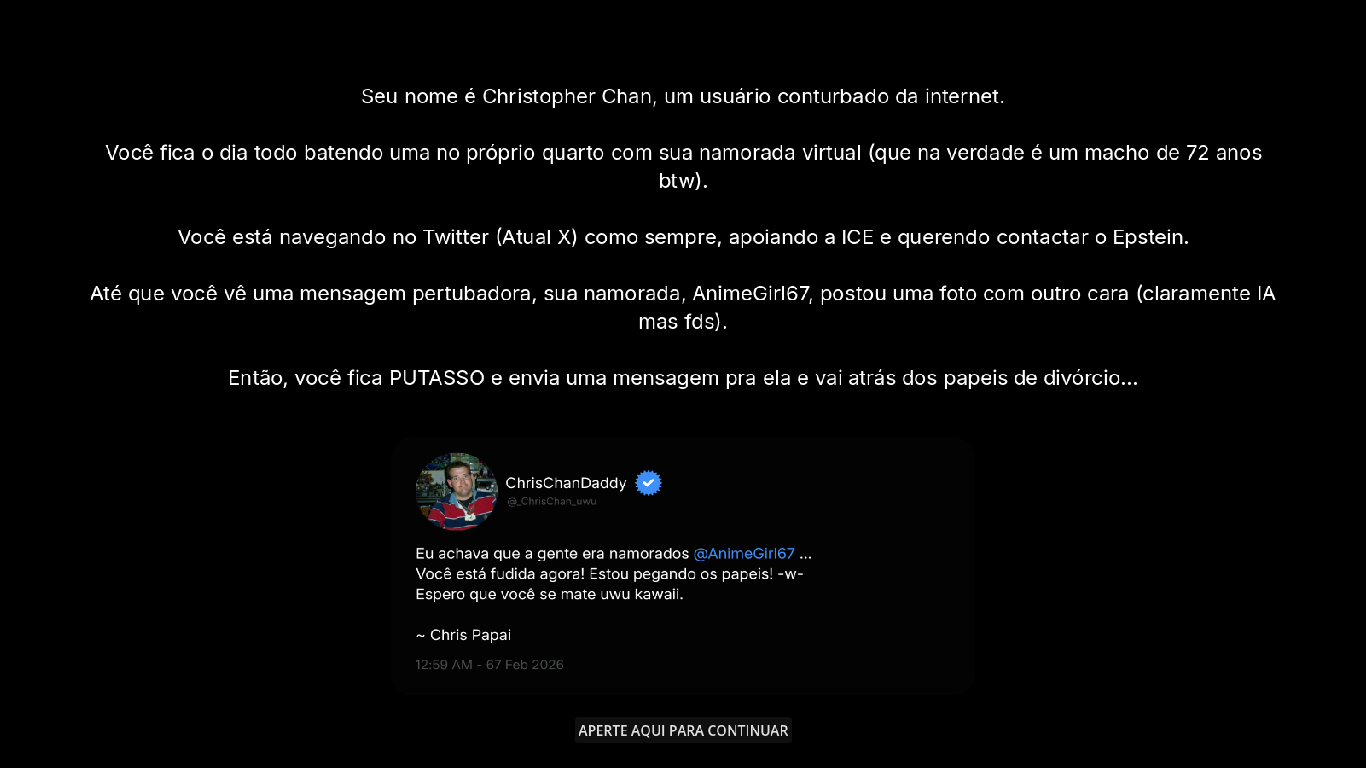 ATENÇÃO: Se você achou isso por acaso ou estava vendo meu perfil, ESSE JOGO É UMA PIADA E NÃO DEVE SER LEVADO A SÉRIO. Pessoas e eventos semelhantes da vida real não foram pegos para fazer esse jogo. Também, esse jogo foi feito em mais ou menos 3 dias, então, não espere muita coisa.